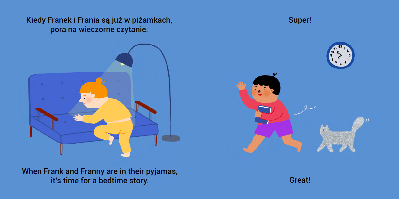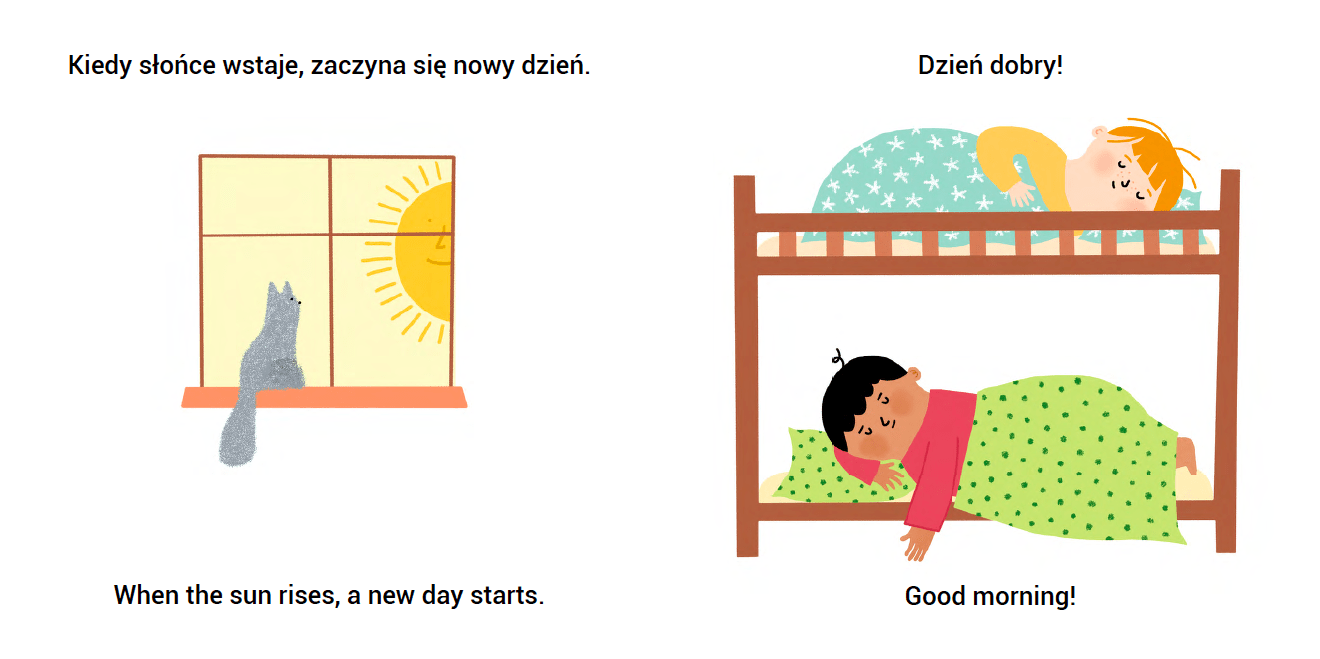 Opowieść w książce toczy się spokojnym, znanym i bliskim dzieciom rytmem dnia i nocy. Poznają i uczą się nazywać codzienne czynności, a także zwroty na dobry dzień i na dobranoc. Franek, Frania i Felix spędzają dzień dokładnie tak, jak mali czytelnicy. A jak koty spędzają dzień? Okazuje się, że zdecydowanie dłużej śpią!