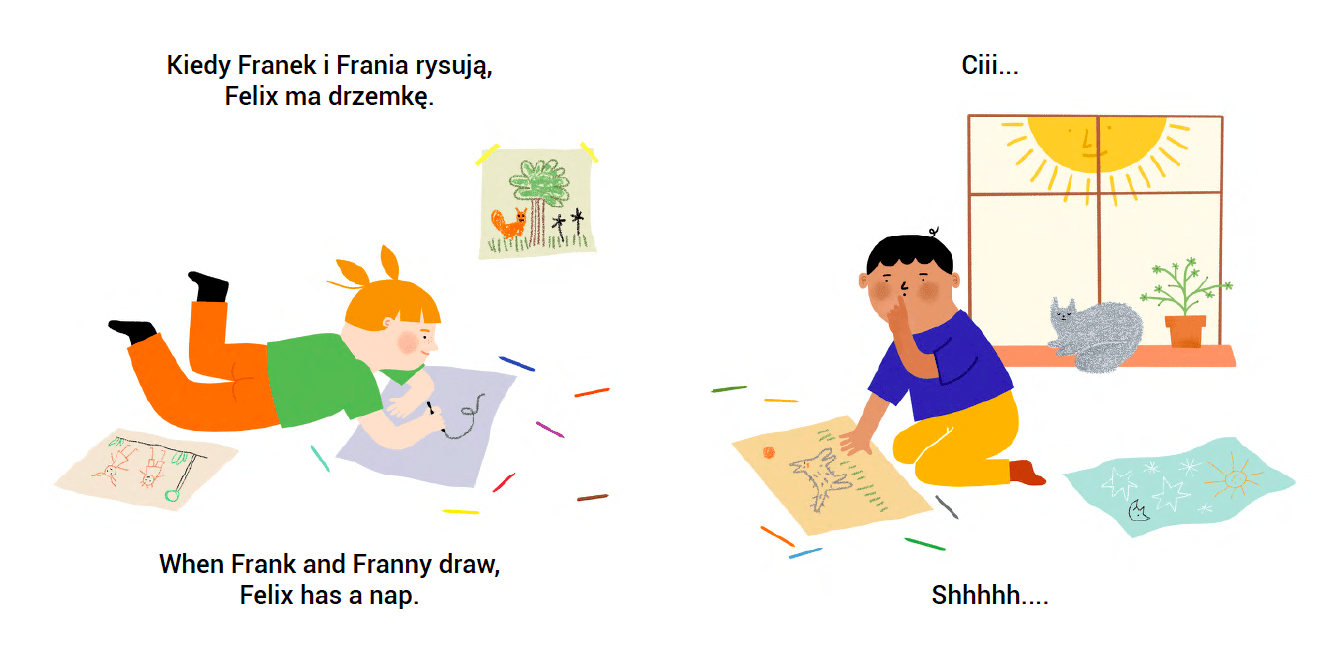 Franek, Frania & Felix to seria kartonówek dla najmłodszych skonstruowana w taki sposób, by otwierała na kontakt z językiem obcym oraz – a może przede wszystkim – dawała przyjemność z obcowania z książką. Można ją czytać po polsku lub po angielsku, a także puścić wodze fantazji i tworzyć własne historie o sympatycznych bohaterach.