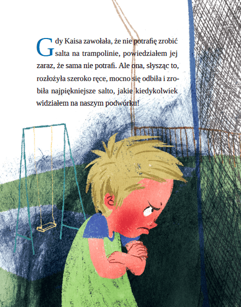Tego dnia, gdy Mati wychodzi z domu, jego koleżanka Kaisa już skacze na trampolinie. Kaisa umie robić wspaniałe salto, a Mati nie, i już samo to jest naprawdę denerwujące. A gdy dziewczynka zaczyna się z chłopca naśmiewać, jego złość rośnie i rośnie, aż przestaje się w nim mieścić… Chciałby dać jej nauczkę, ale… nie może się do niej dostać, bo na trampolinie może być tylko jedna osoba na raz… Stara się ją zignorować, ale to nie takie proste…