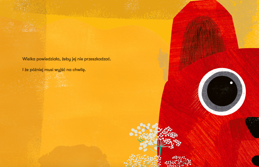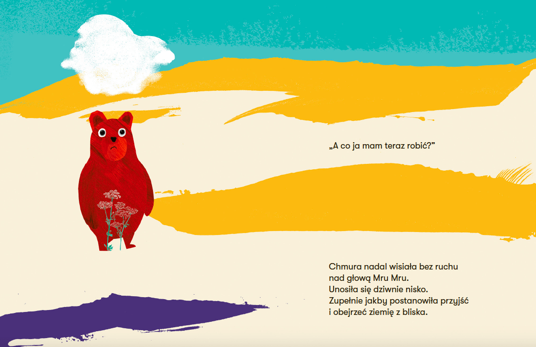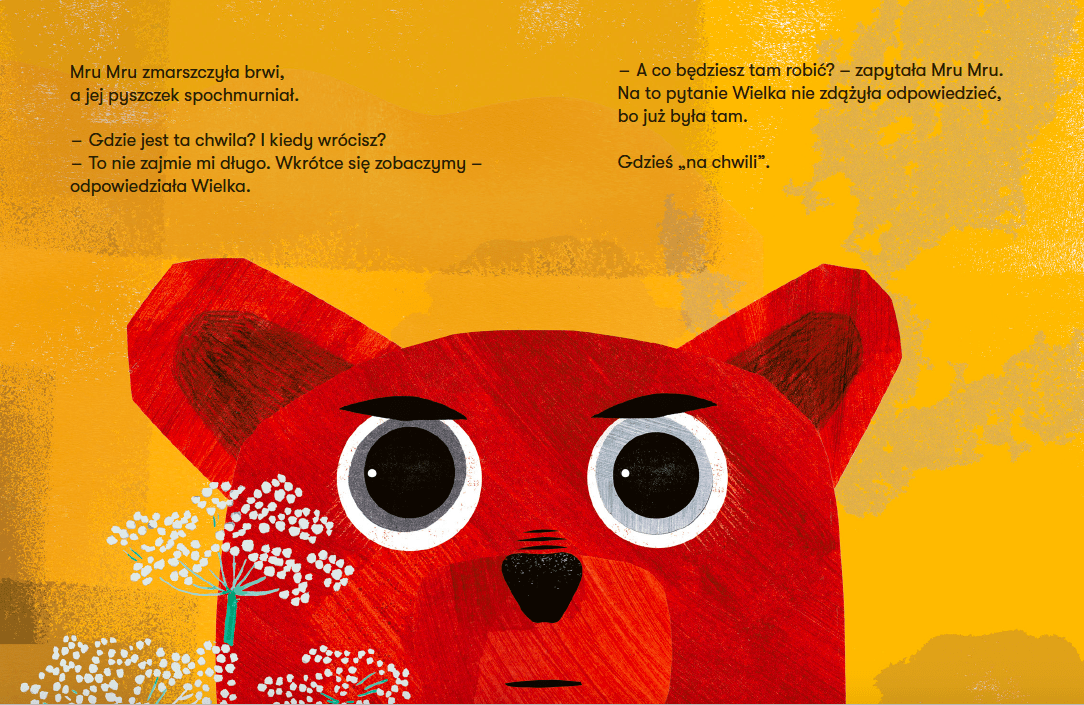 Tego dnia, gdy na nosie Mru Mru wylądowała kropla deszczu, niedźwiadka odkryła coś naprawdę wspaniałego i zabawnego. Była jednak sama. Wielka musiała wyjść na chwilę i powiedziała, żeby jej nie przeszkadzać. A tak wspaniale byłoby podzielić się radością! Jak długo może trwać taka chwila?