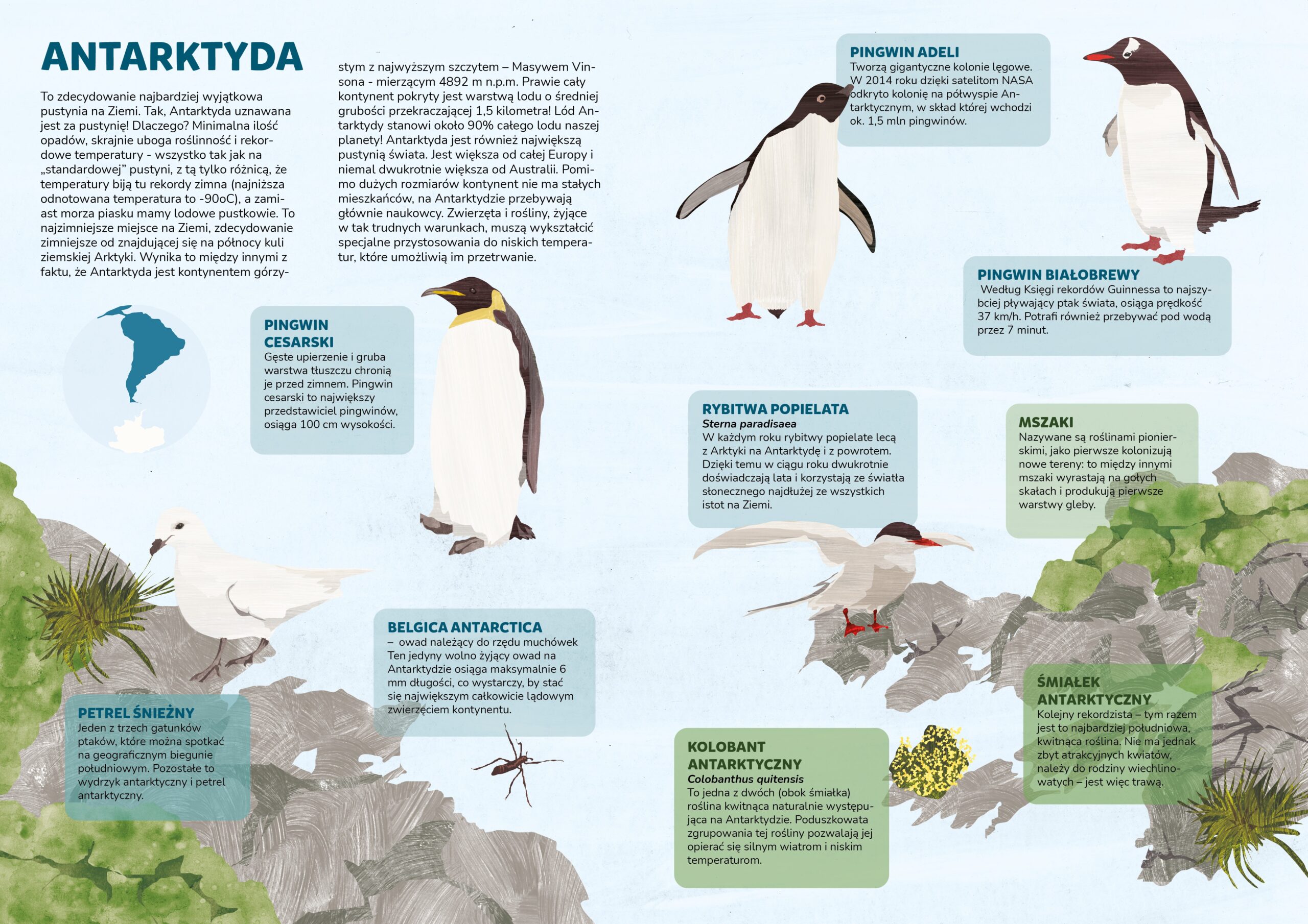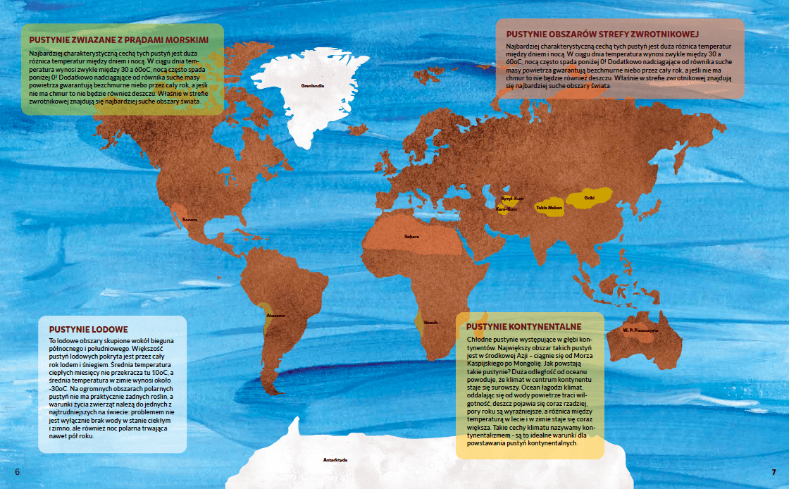 Dwustronny ilustrowany z malarskim rozmachem album dla miłośników przyrody, dalekich podróży oraz wszystkich, którzy lubią wiedzieć więcej. Kompendium wiedzy o wodach i pustyniach na Ziemi oraz zasiedlających je mieszkańcach.