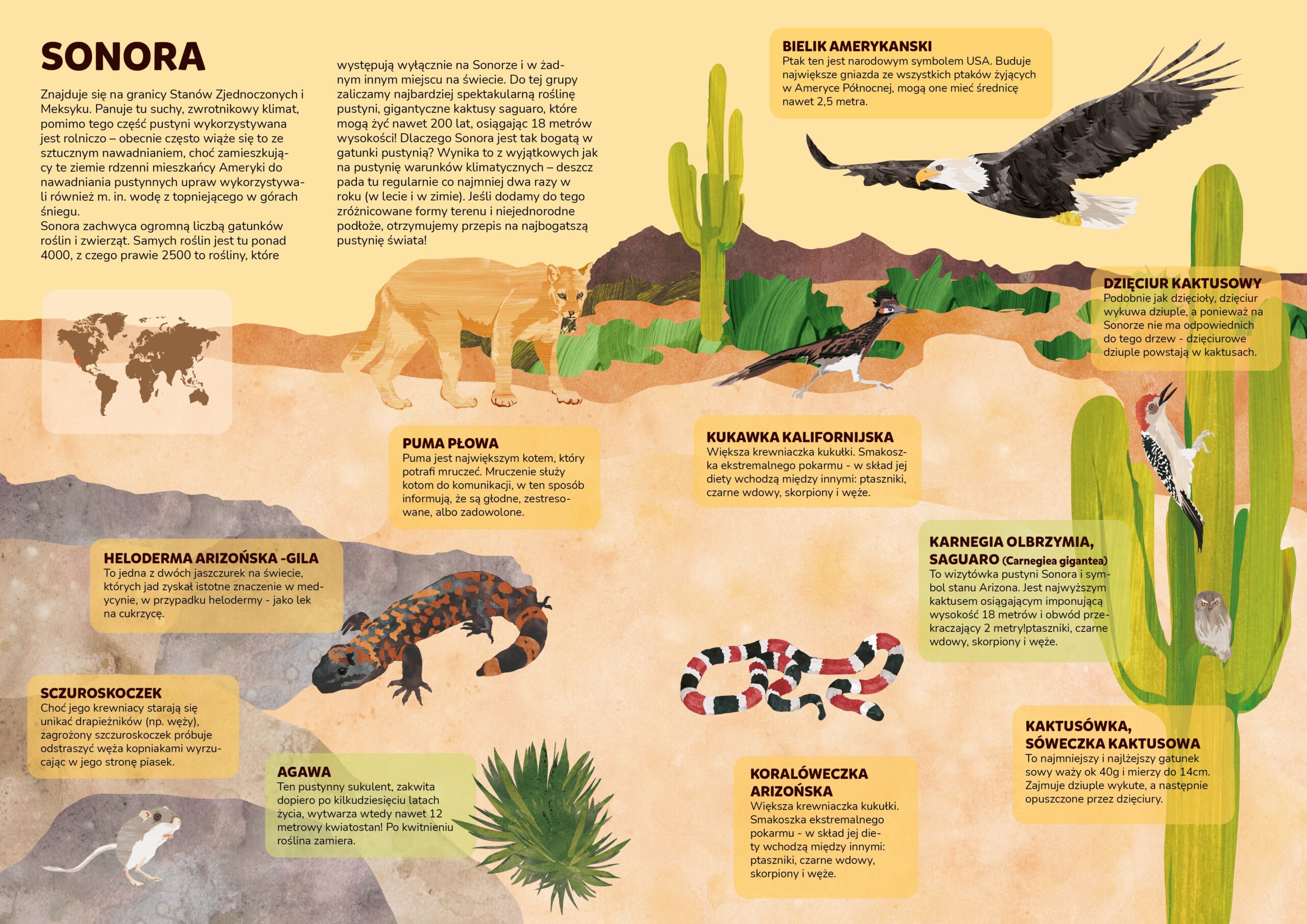 Opowieść o pustyniach wyjaśnia, w jaki sposób powstają, w jakich miejscach na Ziemi się znajdują oraz czym charakteryzują się tereny pustynne. To ciekawe tym bardziej, że pustynia wcale nie oznacza morza piasku, na którym co jakiś czas znajdują się wydmy, jak mogłoby się wydawać. Rodzajów pustyń jest naprawdę wiele, a natury nie da się tak łatwo zaszufladkować. Na wszystkich jednak panują wyjątkowo trudne warunki do życia. Dlatego zwierzęta, które je zamieszkują, mają wielce ciekawe tajemnice i zwyczaje!