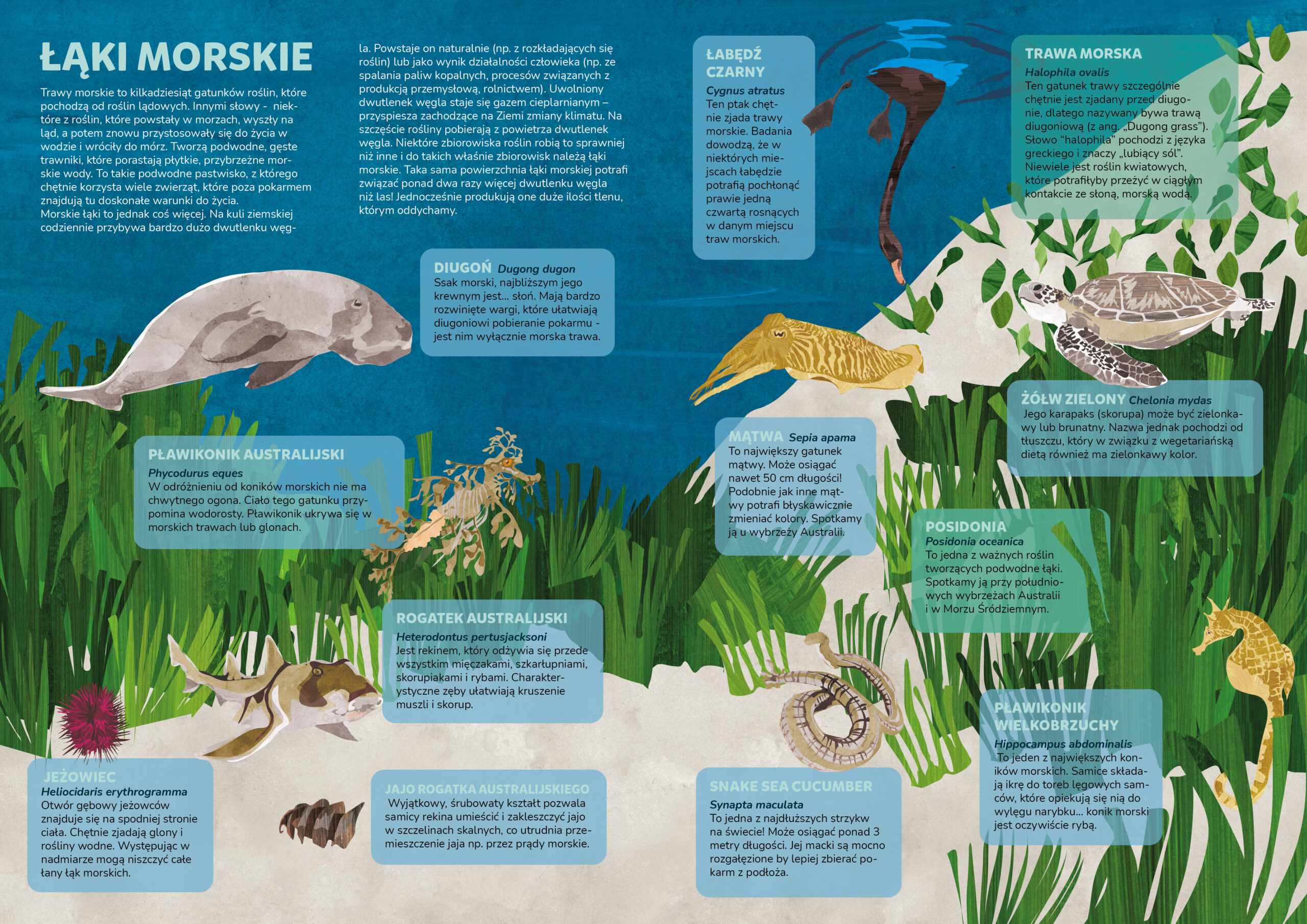 Podróżując przez wszechocean czytelnik odwiedzi zarówno największe głębiny, jak i strefę pływów. Dowie się, czym są pelagial, estuaria i kominy hydrotermalne. Rzuci okiem na rafy koralowe i podwodne łąki. A także pozna mnóstwo niesamowitych stworzeń, które je zamieszkują – wszystkie mają szczególne umiejętności i dary, dzięki którym są naprawdę wyjątkowe i wszystkie tworzą łańcuch pokarmowy, dzięki któremu w środowisku morskim panuje równowaga.