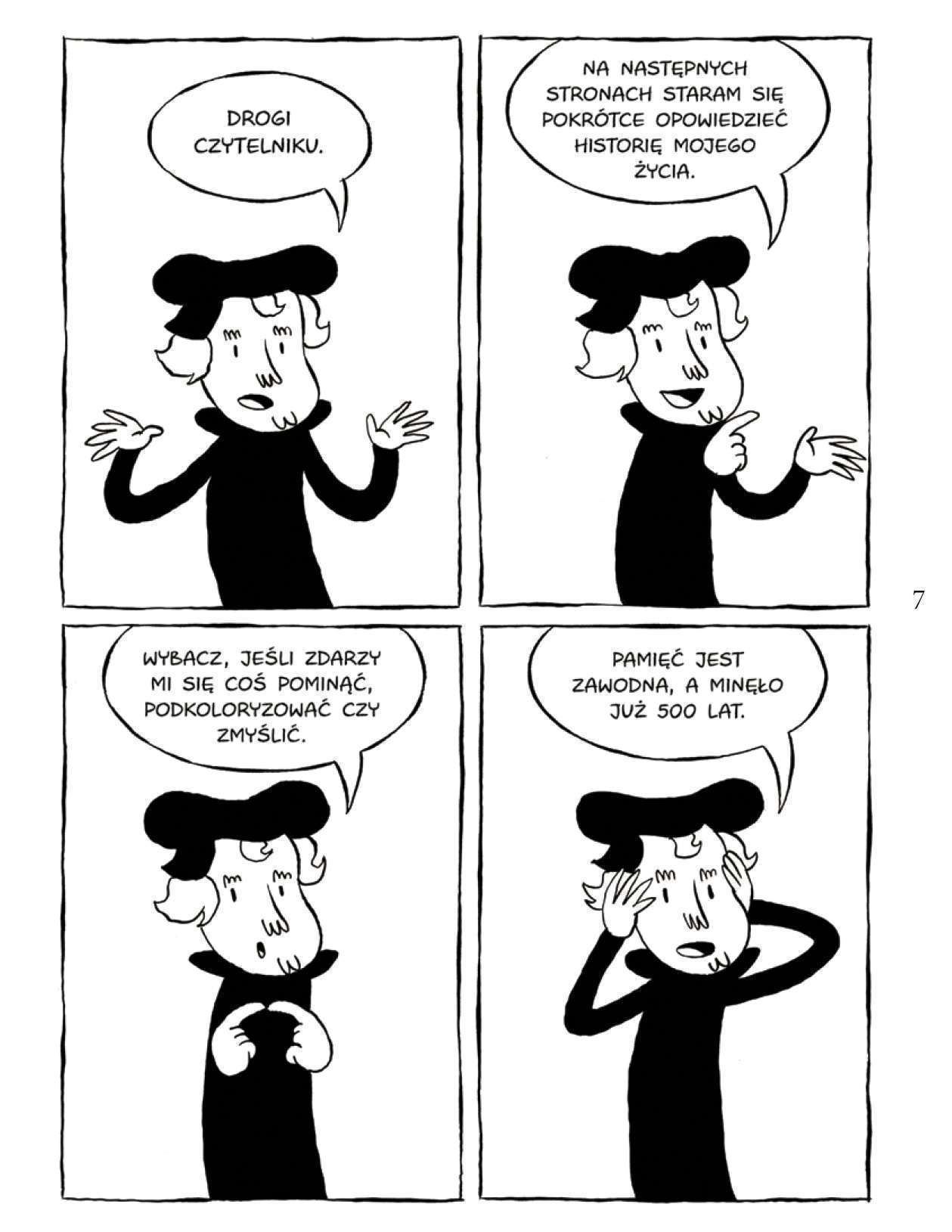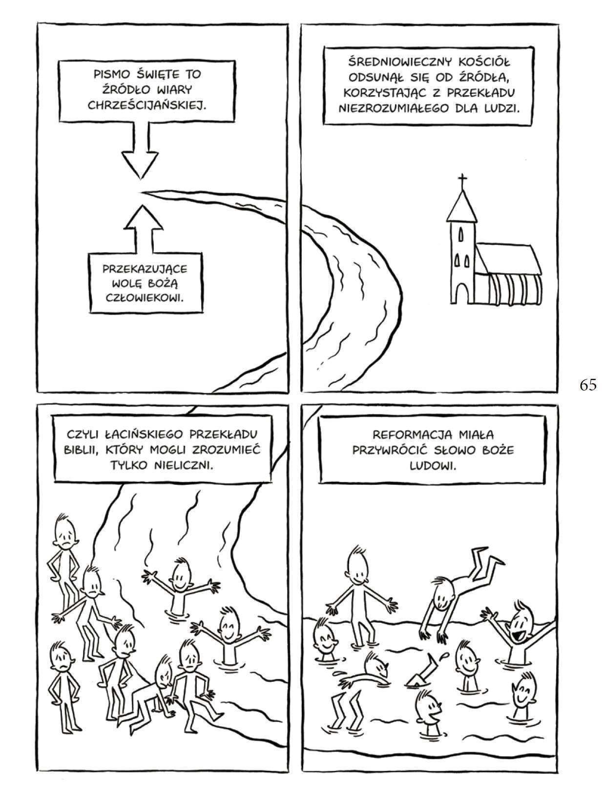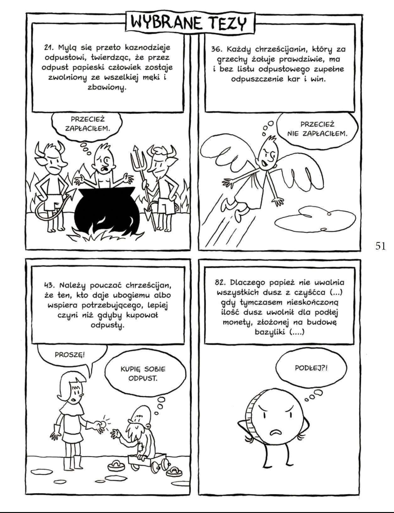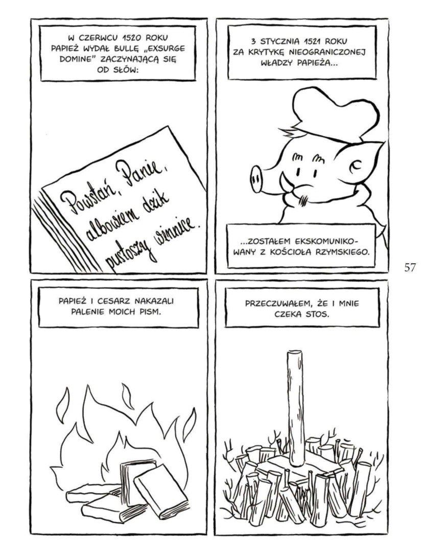 Plansze z zabawnymi kadrami w podziale na cztery opowiadają chronologicznie historię Marcina Lutra, natomiast między planszami znajdują się najważniejsze hasła, pojęcia oraz definicje doprecyzowujące wydarzenia i fakty opowiedziane obrazem i dymkami. Wszystko to składa się na opowieść o przełomie średniowiecza i renesansu, o budzeniu się nowych humanistycznych idei.