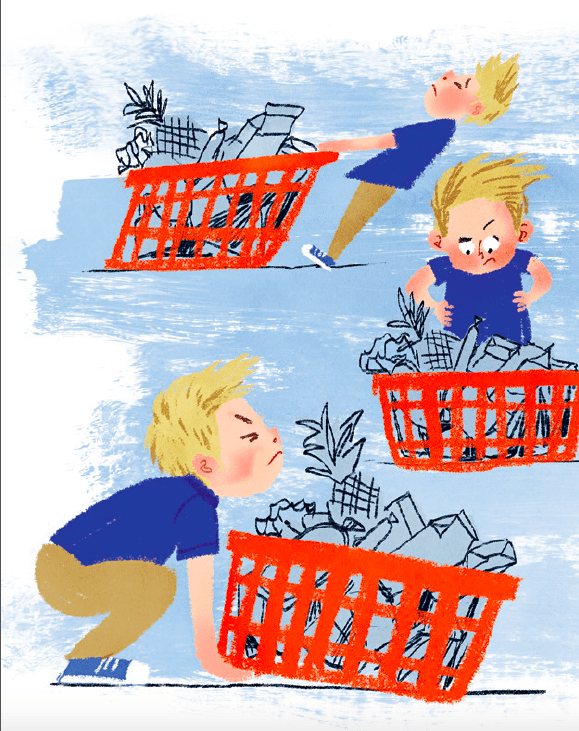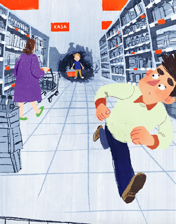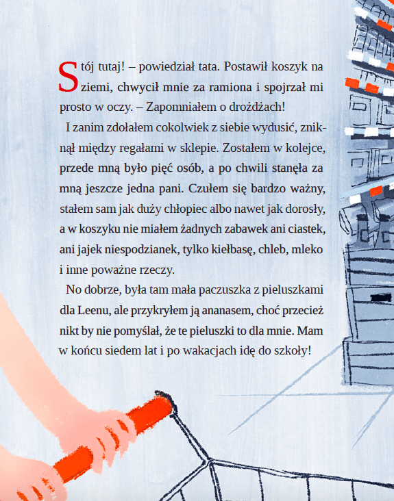 W kolejce do kasy tata przypomina sobie o drożdżach. Każe Matiemu zostać, a sam idzie ich szukać. Chłopiec czeka – dumny, bo w koszyku ma same poważne zakupy – ale kolejka posuwa się naprzód, a taty nie widać. Co się stanie, jeśli tata nie wróci, a trzeba będzie zapłacić za zakupy?